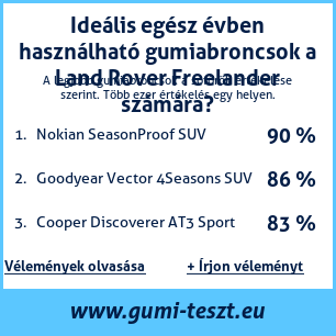 Ha saját autós témájú weboldala van, vagy gumiabroncs-beszállító, elhelyezheti weboldalán az autógumiabroncsok minősítő táblánkat Land Rover Freelander: Gumiabroncsteszt Land Rover Freelander [png] ![]()