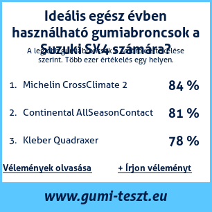 Új S-Crossom van. Szárazon hibátlan. Esős időben nyáron hajlamos csúszni. Na de télies időben, 10 fok alatt esős időben kb. életveszély, rohadtul csúszik sima aszfalton, ha vizes az út. 25 ezer km van a gumijaimban. Nagyon óvatosan kell vezetni vele... soha többé ilyet. Hó nincs sok, de csapadék viszont rengeteg egy év alatt, így veszélyes... Hogy lehet ez tesztgyőztes. Egész szezonális gumiabroncstesztÁltalános értékelés: 70 %