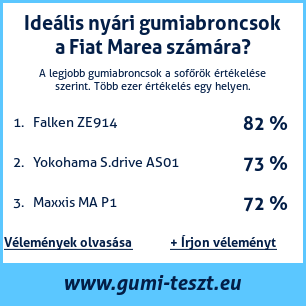 Ha saját autós témájú weboldala van, vagy gumiabroncs-beszállító, elhelyezheti weboldalán az autógumiabroncsok minősítő táblánkat Fiat Marea: Gumiabroncsteszt Fiat Marea [png] ![]()