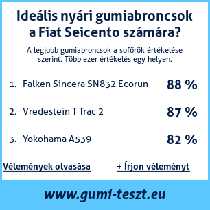 Ha saját autós témájú weboldala van, vagy gumiabroncs-beszállító, elhelyezheti weboldalán az autógumiabroncsok minősítő táblánkat Fiat Seicento: Gumiabroncsteszt Fiat Seicento [png] ![]()