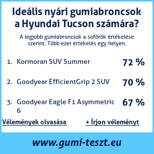 Ha saját autós témájú weboldala van, vagy gumiabroncs-beszállító, elhelyezheti weboldalán az autógumiabroncsok minősítő táblánkat Hyundai Tucson: Gumiabroncsteszt Hyundai Tucson [png] ![]()
