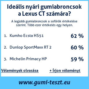 Ha saját autós témájú weboldala van, vagy gumiabroncs-beszállító, elhelyezheti weboldalán az autógumiabroncsok minősítő táblánkat Lexus CT: Gumiabroncsteszt Lexus CT [png] ![]()