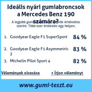 Tesztek, vélemények és vélemények a Mercedes Benz 190 Nyári gumiabroncsokról. Ezen a járművön felhasználóink leggyakrabban a következő gumiabroncsméreteket használják 255 35 R18, 225 45 R17, 235 35 R19, 255 30 R19, 245 40 R17. A többi vezető által a Mercedes Benz 190 Nyári gumiabroncsokról írt véleményeinek áttekintésével próbáljuk meg a lehető legobjektívebb információkat nyújtani önnek, hogy segítsen kiválasztani a Nyári gumiabroncsokat. Minél több értékelés, annál pontosabb és hitelesebb a vélemény. Nagy hangsúlyt fektetünk arra, hogy az értékelések a lehető legobjektívebbek legyenek.
