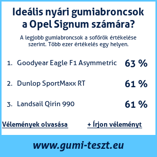 Ha saját autós témájú weboldala van, vagy gumiabroncs-beszállító, elhelyezheti weboldalán az autógumiabroncsok minősítő táblánkat Opel Signum: Gumiabroncsteszt Opel Signum [png] ![]()