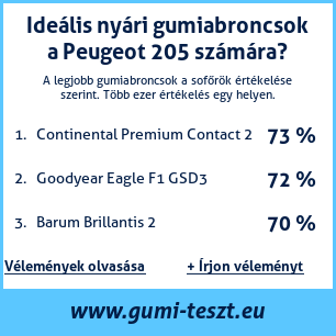 Ha saját autós témájú weboldala van, vagy gumiabroncs-beszállító, elhelyezheti weboldalán az autógumiabroncsok minősítő táblánkat Peugeot 205: Gumiabroncsteszt Peugeot 205 [png] ![]()