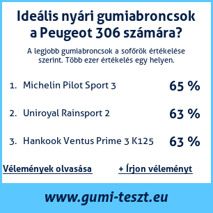 Ha saját autós témájú weboldala van, vagy gumiabroncs-beszállító, elhelyezheti weboldalán az autógumiabroncsok minősítő táblánkat Peugeot 306: Gumiabroncsteszt Peugeot 306 [png] ![]()