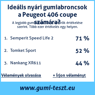 Ha saját autós témájú weboldala van, vagy gumiabroncs-beszállító, elhelyezheti weboldalán az autógumiabroncsok minősítő táblánkat Peugeot 406 coupe: Gumiabroncsteszt Peugeot 406 coupe [png] ![]()