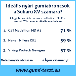 Ha saját autós témájú weboldala van, vagy gumiabroncs-beszállító, elhelyezheti weboldalán az autógumiabroncsok minősítő táblánkat Subaru XV: Gumiabroncsteszt Subaru XV [png] ![]()