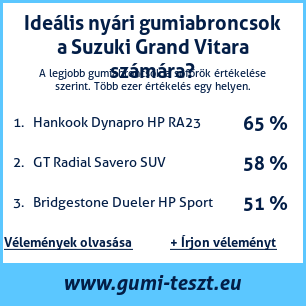 Ha saját autós témájú weboldala van, vagy gumiabroncs-beszállító, elhelyezheti weboldalán az autógumiabroncsok minősítő táblánkat Suzuki Grand Vitara: Gumiabroncsteszt Suzuki Grand Vitara [png] ![]()