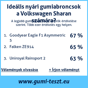 Ha saját autós témájú weboldala van, vagy gumiabroncs-beszállító, elhelyezheti weboldalán az autógumiabroncsok minősítő táblánkat Volkswagen Sharan: Gumiabroncsteszt Volkswagen Sharan [png] ![]()