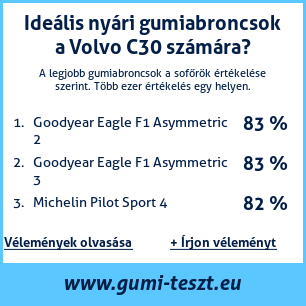 Ha saját autós témájú weboldala van, vagy gumiabroncs-beszállító, elhelyezheti weboldalán az autógumiabroncsok minősítő táblánkat Volvo C30: Gumiabroncsteszt Volvo C30 [png] ![]()