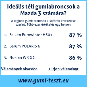 Ha saját autós témájú weboldala van, vagy gumiabroncs-beszállító, elhelyezheti weboldalán az autógumiabroncsok minősítő táblánkat Mazda 3: Gumiabroncsteszt Mazda 3 [png] ![]()