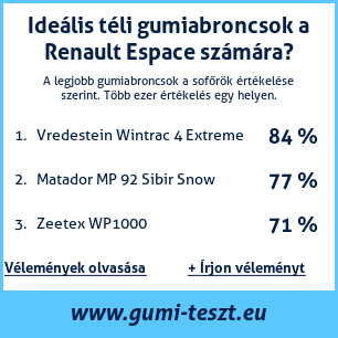 Ha saját autós témájú weboldala van, vagy gumiabroncs-beszállító, elhelyezheti weboldalán az autógumiabroncsok minősítő táblánkat Renault Espace: Gumiabroncsteszt Renault Espace [png] ![]()
