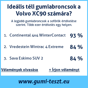 Ha saját autós témájú weboldala van, vagy gumiabroncs-beszállító, elhelyezheti weboldalán az autógumiabroncsok minősítő táblánkat Volvo XC90: Gumiabroncsteszt Volvo XC90 [png] ![]()